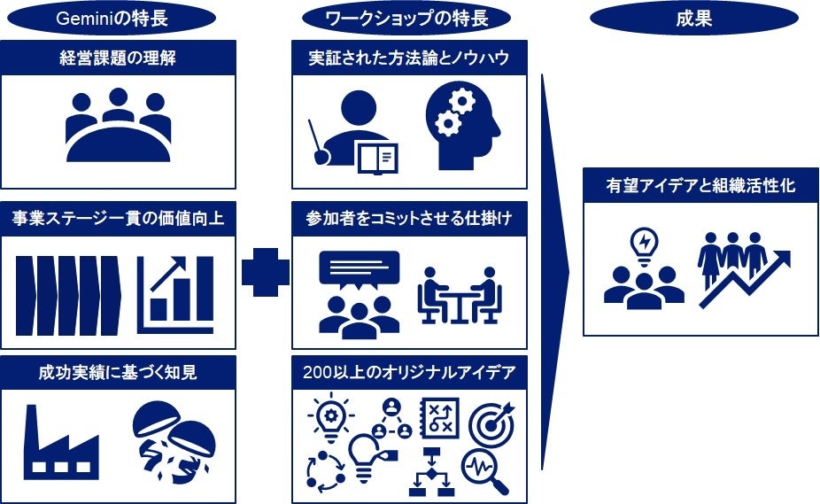 経営支援と新製品・サービス開発実務の両面で成功体験を持つプロフェッショナルが、属人的な能力や偶然に左右されることなく、確実に新たな製品・サービスの開発に成功する「型」と「応用」を、ワークショップ参加チームとタッグを組み「伴走型」で伝授することで、有望なアイデアと組織の活性化を実現します。