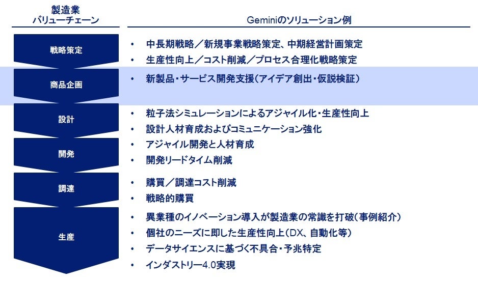 Geminiは実際に、規模を問わず製造業各社様にバリューチェーン上の各プロセスに対応するソリューションをご提供しており、デジタル化や自動化、および人材や組織、新製品・サービス開発や新規事業に関するご支援の中でオープンイノベーションやデザイン思考等都度最先端の方法論と技術を取り入れ、Geminiならではのご支援や、システムの実装まで解決策を提供してまいりました。