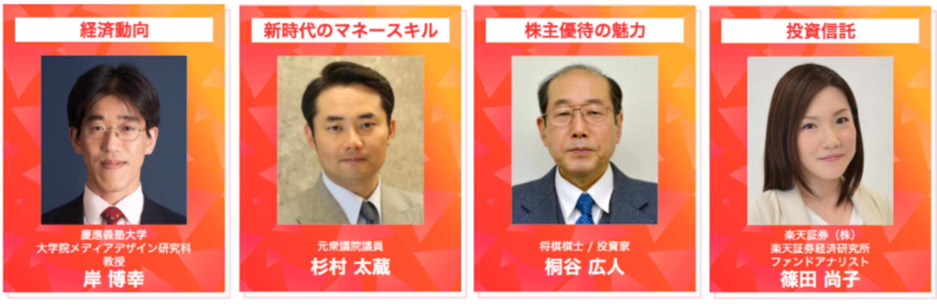 【桐谷広人 氏/杉村太蔵 氏/岸博幸 氏】など、メディアでも注目されている講師が多数登壇予定であり、【経済・株式投資・不動産投資・FX・ライフプラン】など多様なテーマで講演します。