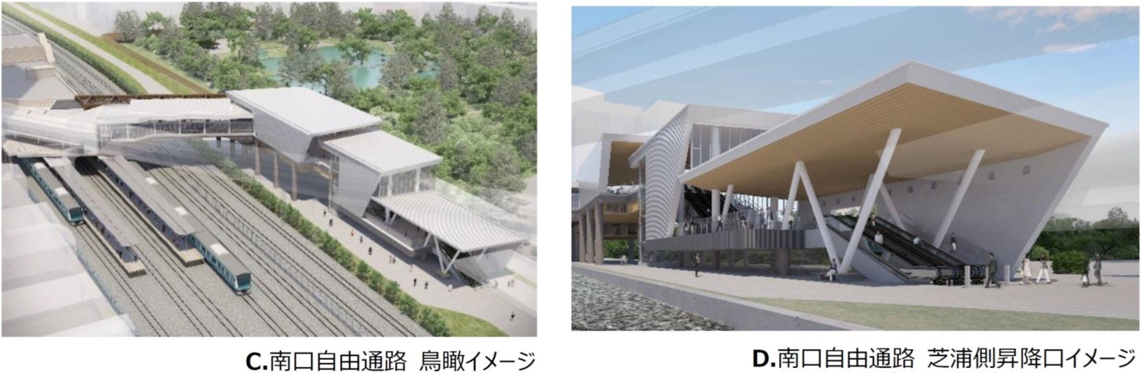 浜松町駅南口には既存の自由通路に加え新たな自由通路を整備し、混雑緩和やバリアフリーへの対応を図ります。これにより、浜松町二丁目エリアと、芝浦エリアをつなぐ歩行者ネットワークを強化します。(新たな自由通路は2024年度使用開始予定。その後既存の自由通路を改修し、2026年度全面使用開始予定。)