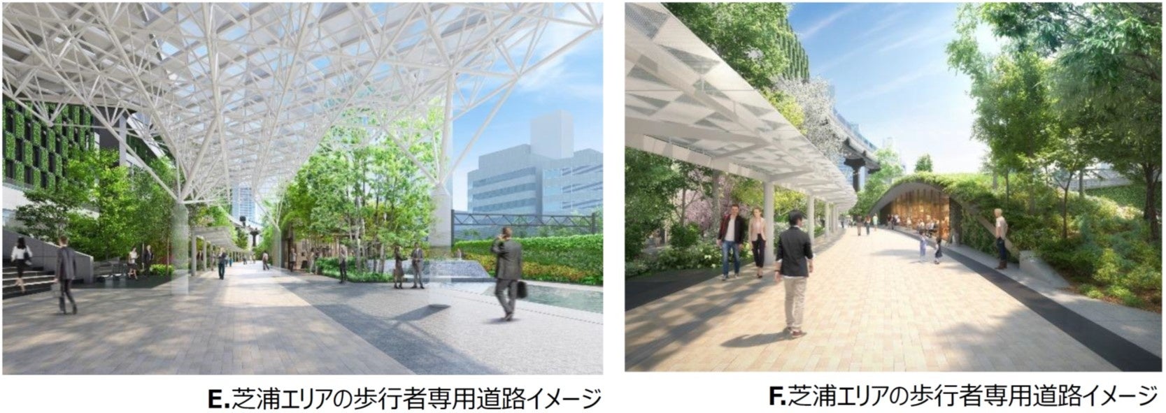 浜松町駅東側には、旧芝離宮庭園に沿って歩行者専用道路を整備します。これにより、竹芝・汐留方面と、芝浦方面が緑豊かな空間でつながります。浜松町駅から芝浦プロジェクトにかけて庇を設置することにより、雨に濡れずアクセス可能となります。
