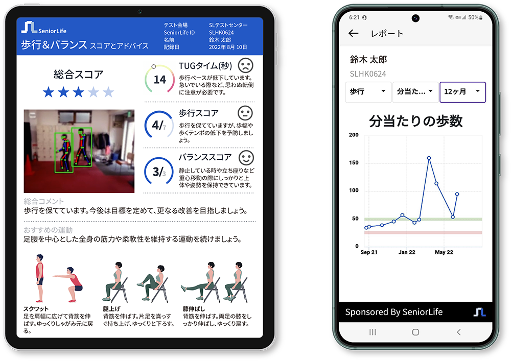 高齢者を対象に独自のAIアルゴリズム、コンピュータビジョン、暗号化技術を活用し、歩行における障害や膝の曲げ伸ばしの状態、バランスや重心障害などのMSK障害を検出し、問題点に対してのトレーニング等のアドバイスを行います。また数カ月後に再テストを行い、健康スコアが改善されたか確認することができます。