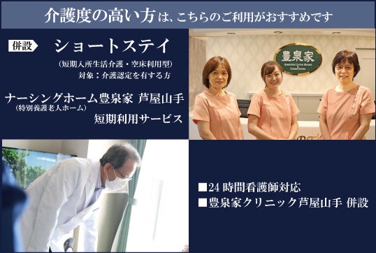 介護度の高い方は、併設している、ナーシングホーム豊泉家 芦屋山手(特別養護老人ホーム)の短期利用サービス(1泊2日~)のショートスティもお勧めです。