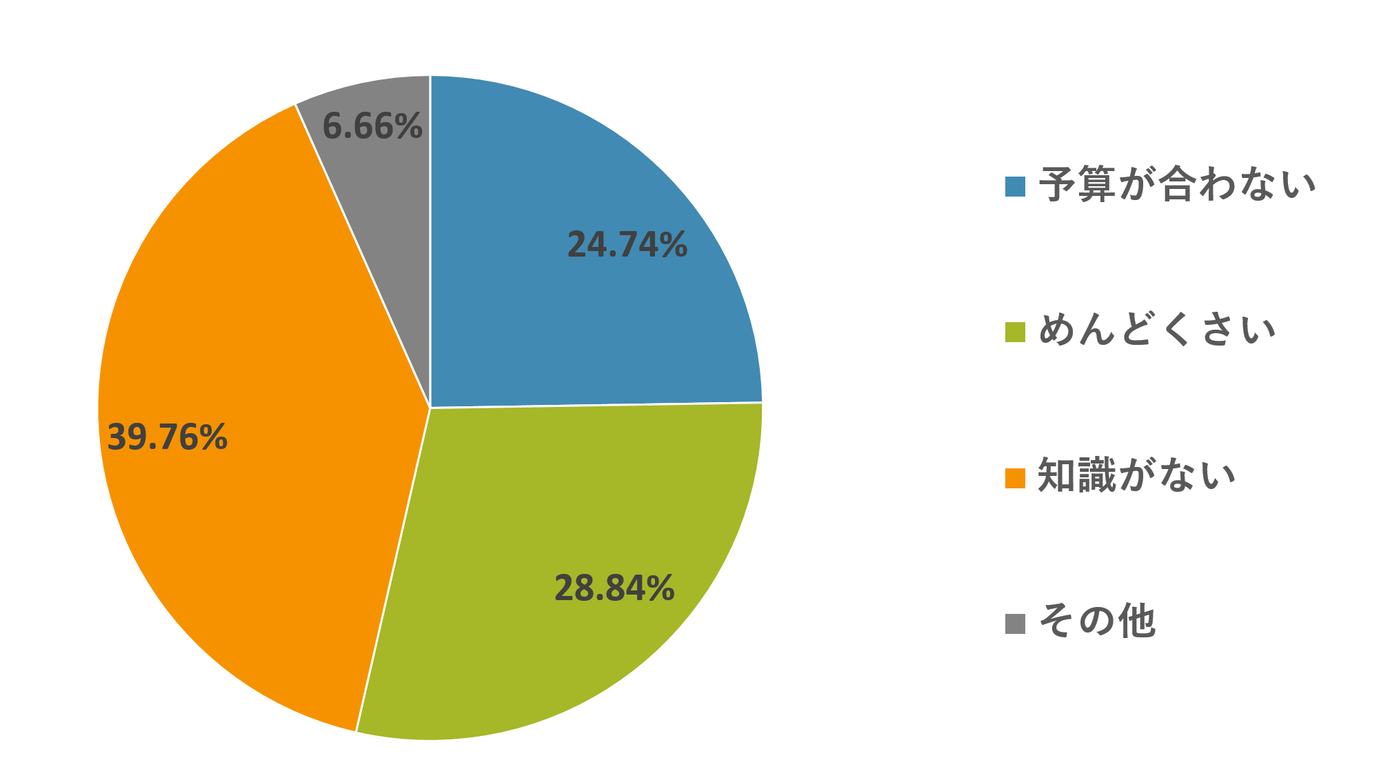 「ℚ2で「そもそも着ない」と答えた方にお伺いします。着ない理由は何ですか。」に対し、「予算が合わない 24.74%」「めんどくさい 28.84%」「知識がない 39.76」「その他 6.66%」と回答。