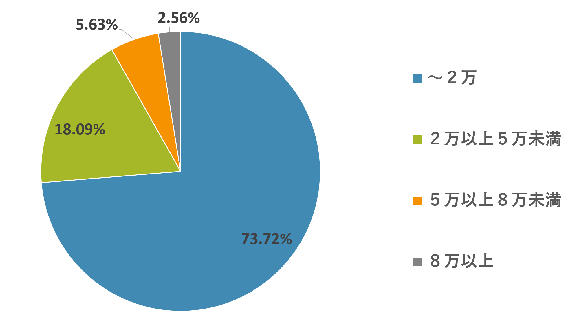 「ℚ2でレンタルと答えた方にお伺いします。レンタルの予算はいくらくらいですか。」に対し、「〜2万 73.72%」「2万以上5万未満 18.09%」「5万以上8万未満 5.63%」「8万以上 2.56%」と回答。