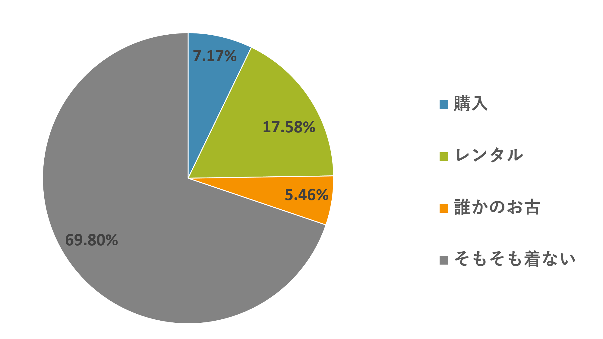 「ℚ1で「はい」と答えた方にお伺いします。着物や袴はどうしますか。」に対し、「購入 7.17%」「レンタル 17.58%」「誰かのお古 5.46%」「そもそも着ない 69.80%」と回答。
