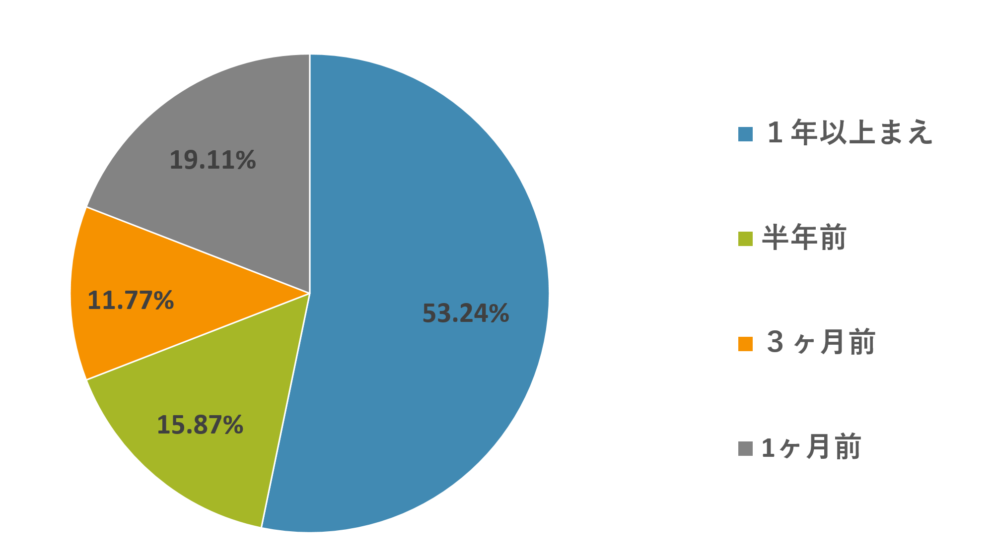 「ℚ2で購入・レンタル・誰かのお古と答えた方にお伺いします。イベントのどれくらい前に着物や袴を用意しますか。」に対し、「1年以上まえ 53.24%」「半年前 15.87%」「3ヶ月前 11.77%」「1ヶ月前 19.11%」と回答。