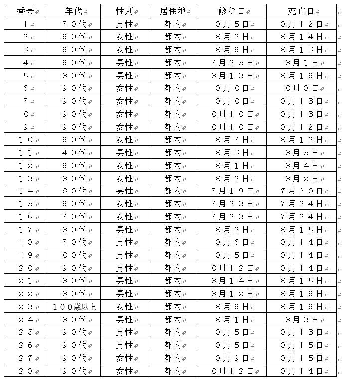 新型コロナウイルスに関連した患者の死亡について business Twitter Facebook はてブ Pocket LINE コピー 2022.08.20 この記事は約1分で読めます。 都内で新型コロナウイルスに感染した方が死亡されましたのでお知らせします。 お亡くなりになった方のご冥福をお祈り申し上げます。 ※ 患者・御家族の人権尊重・個人情報保護に御理解と御配慮をお願いします。