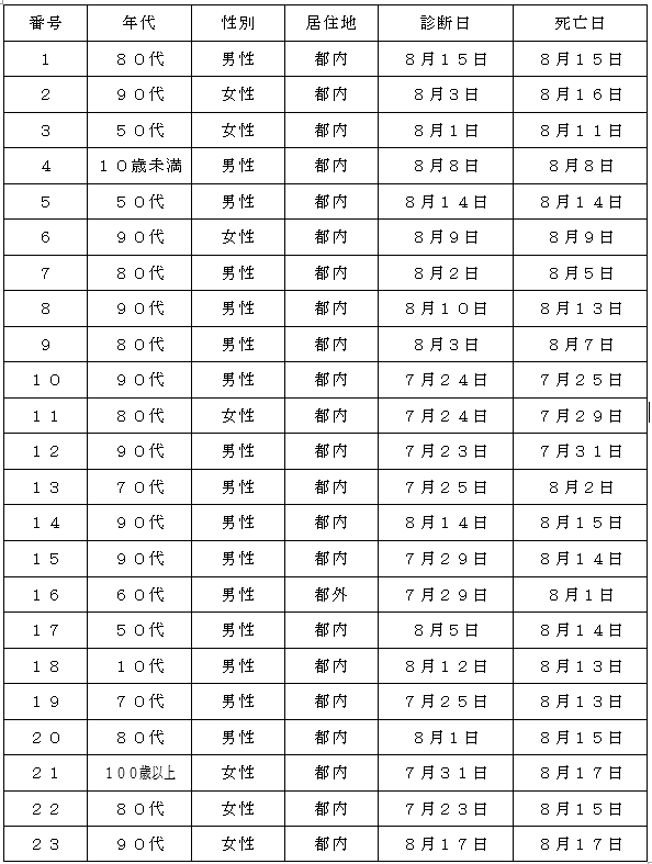 新型コロナウイルスに関連した患者の死亡について business Twitter Facebook はてブ Pocket LINE コピー 2022.08.20 この記事は約1分で読めます。 都内で新型コロナウイルスに感染した方が死亡されましたのでお知らせします。 お亡くなりになった方のご冥福をお祈り申し上げます。 ※ 患者・御家族の人権尊重・個人情報保護に御理解と御配慮をお願いします。