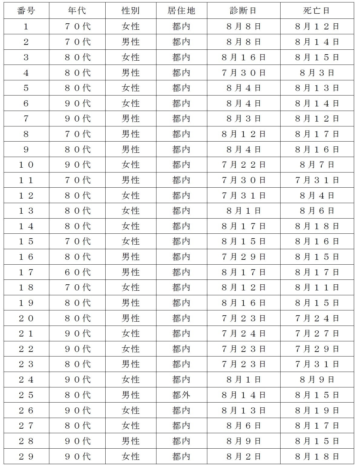 新型コロナウイルスに関連した患者の死亡について business Twitter Facebook はてブ Pocket LINE コピー 2022.08.21 この記事は約1分で読めます。 都内で新型コロナウイルスに感染した方が死亡されましたのでお知らせします。 お亡くなりになった方のご冥福をお祈り申し上げます。 ※ 患者・御家族の人権尊重・個人情報保護に御理解と御配慮をお願いします。