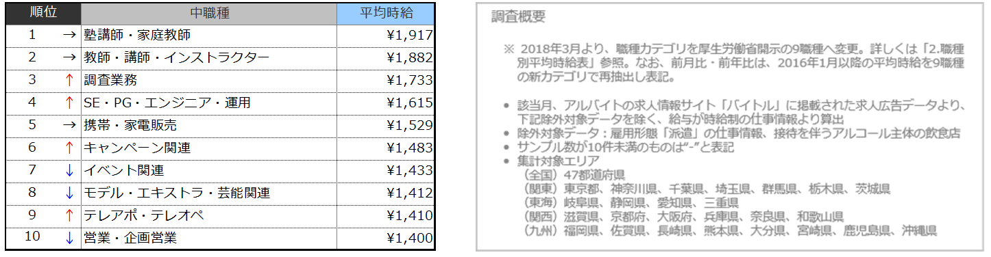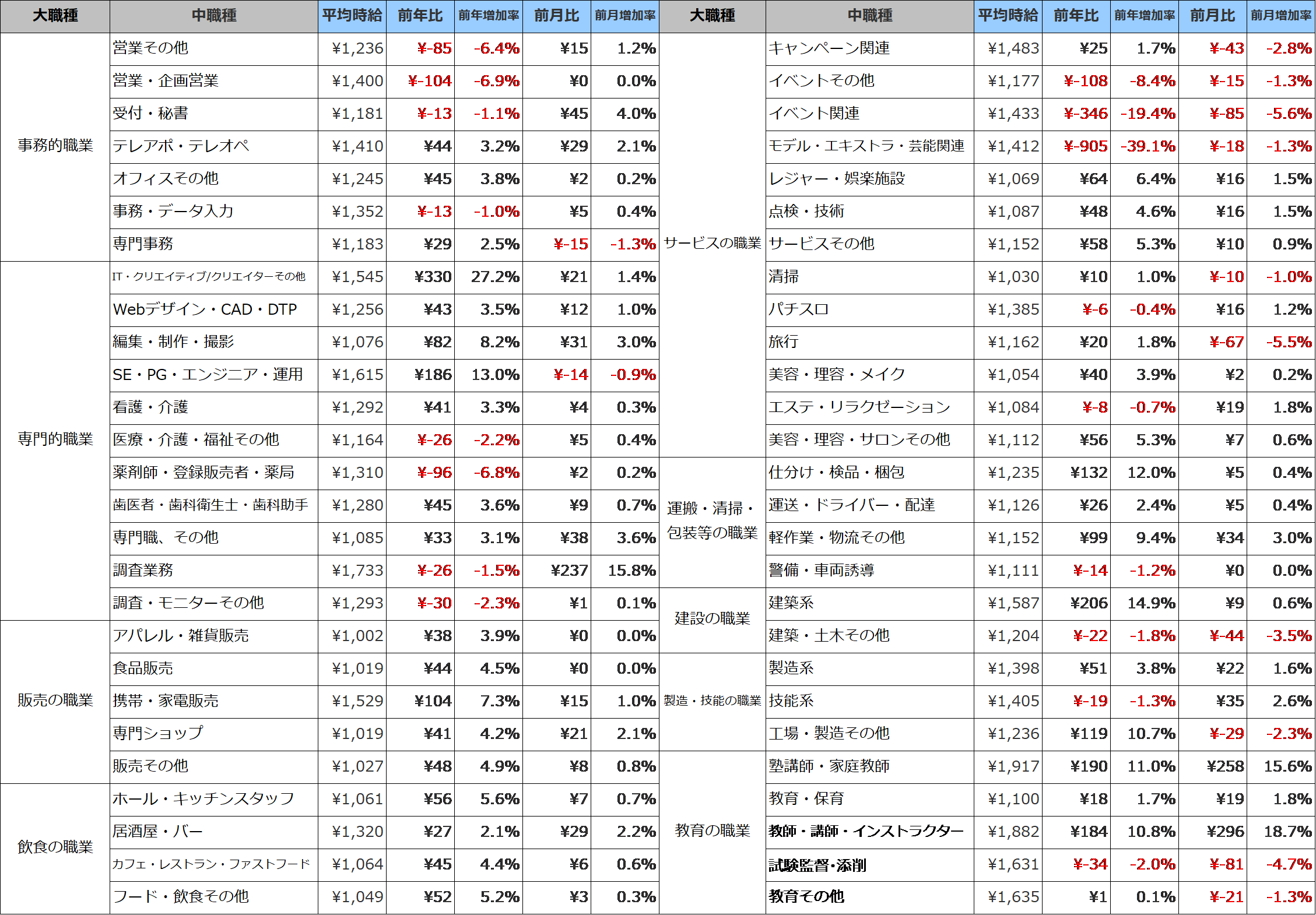 【職種別】9職種全てが前年比プラス。飲食・販売・教育の職業の平均時給は過去最高を更新