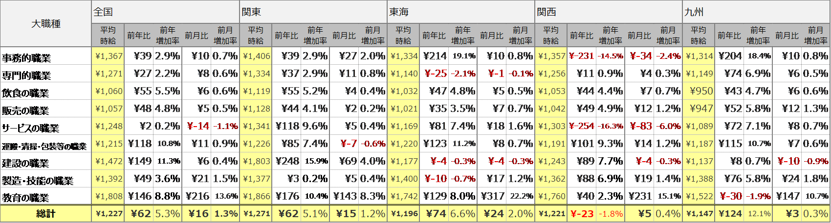 職種別の平均時給は、9職種全ての大カテゴリが前年を上回りました。事務的職業は1,367円(前年比39円増、前月比10円増)、専門的職業は1,271円(前年比27円増、前月比8円増)、飲食の職業は1,060円(前年比55円増、前月比6円増)、販売の職業は1,057円(前年比48円増、前月比5円増)、サービスの職業は1,248円(前年比2円増、前月比14円減)、運搬・清掃・包装等の職業は1,215円(前年比118円増、前月比11円増)、建設の職業は1,472円(前年比149円増、前月比6円増)、製造・技能の職業は1,392円(前年比49円増、前月比21円増)、教育の職業は1,808円(前年比146円増、前月比216円増)となりました。