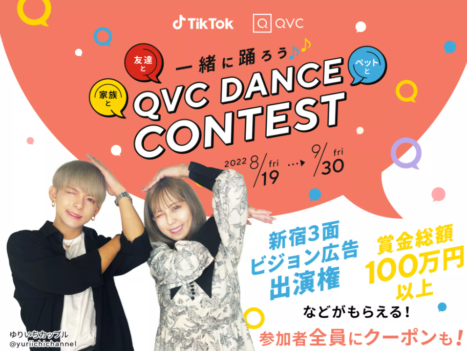 QVCはキャッチーな音楽と共に、ショッピングする楽しさを歌とダンスで表現した新テレビCMを6月13日より放送開始しました。この度、より多くの方々におうちで楽しむQVCのショッピング体験を広めたいという想いから、人気TikTokerであるゆりいちカップルやCMダンスを監修した振付稼業air:manを審査員として迎えて、TikTokでCM音楽に合わせた自由な15秒ダンス動画を募集する「QVCダンスコンテスト」を8月19日(金)から9月30日(金)まで開催します。
