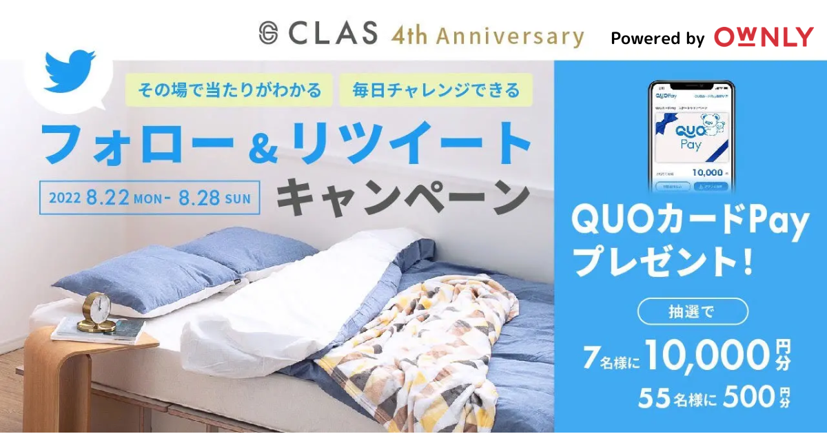 スマートシェア株式会社(東京都渋谷区、代表取締役 西山 統、 以下「当社」)が開発・運営するSNSマーケティングプラットフォームOWNLY(オウンリー)を活用して、家具・家電のサブスク「CLAS(クラス)」を運営する株式会社クラス(東京都目黒区、代表取締役社長 久保 裕丈 )がTwitterフォロー&RTキャンペーンを実施中!