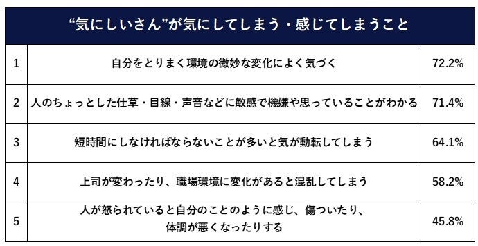 ご自身のことを“気にしい”であると回答した方へ、各項目についてお聞きしたところ、「あてはまる」「ややあてはまる」と回答した方が最も多い項目は、「自分をとりまく環境の微妙な変化によく気づく」72.2%となりました。次いで、「人のちょっとした仕草・目線・声音などに敏感で機嫌や思っていることがわかる」71.4%、「短時間にしなければならないことが多いと気が動転してしまう」64.1%と続きます。多くの“気にしいさん”の特徴として、環境の変化によく気づき、人の動作・機嫌がわかってしまうことが判明しました。