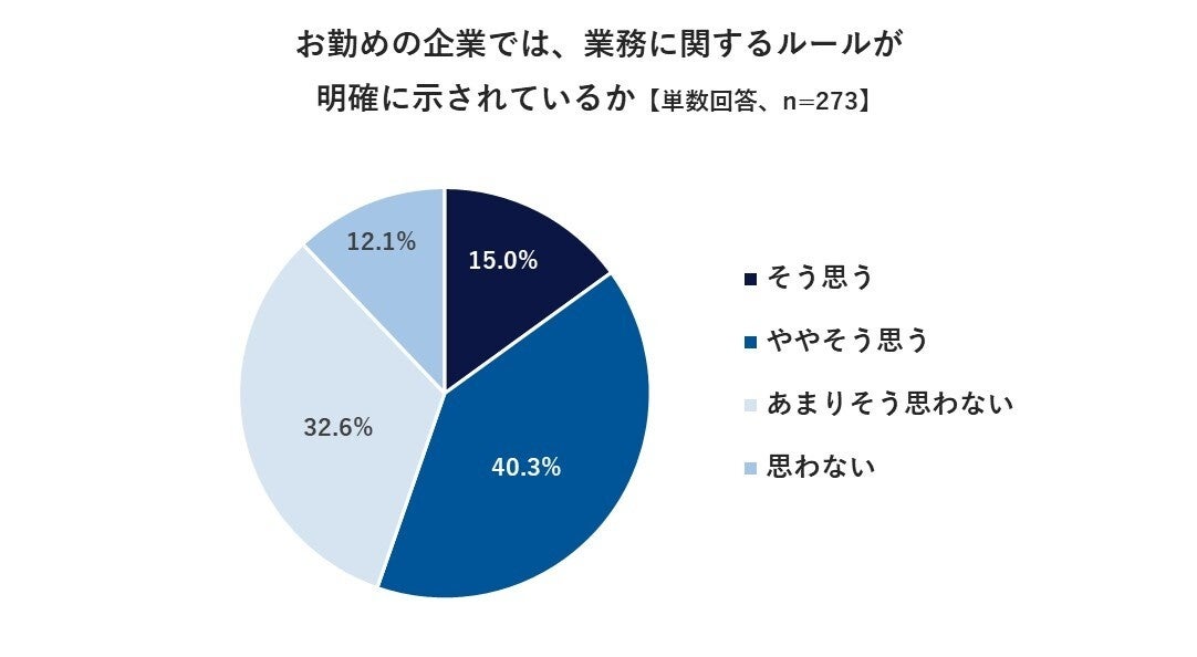 お勤めしている企業について、業務に関するルールが明確に示されているか聞いたところ、「そう思う」15.0%、「ややそう思う」40.3%、「あまりそう思わない」32.6%、「思わない」12.1%でした。「あまりそう思わない」「思わない」の合計は44.7%で約4割の企業で業務に関するルールが明確に示されていないことが明らかになりました。