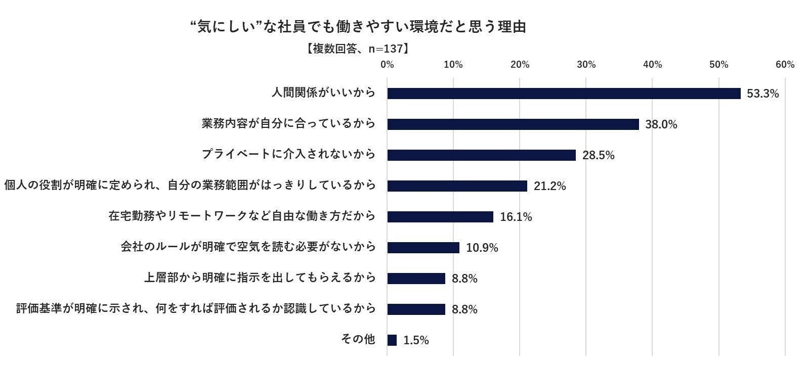 今回の調査結果から、約2人に1のビジネスパーソンが自分のことを”気にしい”な性格であると感じていることがわかりました。“気にしい”だと自覚をもつ人に対し、ストレスを感じたときに出る業務への影響を聞くと(Q2)、最も回答が多かったのは「業務に集中できなくなる」38.5%でした。Q1の回答結果から、環境の変化に敏感で、人の機嫌や思っていることがわかってしまうからこそ、業務以外のことでも気にしてしまいストレスを感じ、集中力が下がってしまうのかもしれません。一方で、たとえ”気にしい”だとしても、働きやすい会社もあるようです。自分が勤める企業のことを、“気にしい”な社員でも働きやすい環境だと思う人に対し、その理由を聞くと(Q4)、「人間関係がいいから」53.3%、「業務内容が自分にあっているから」38.0%でした。