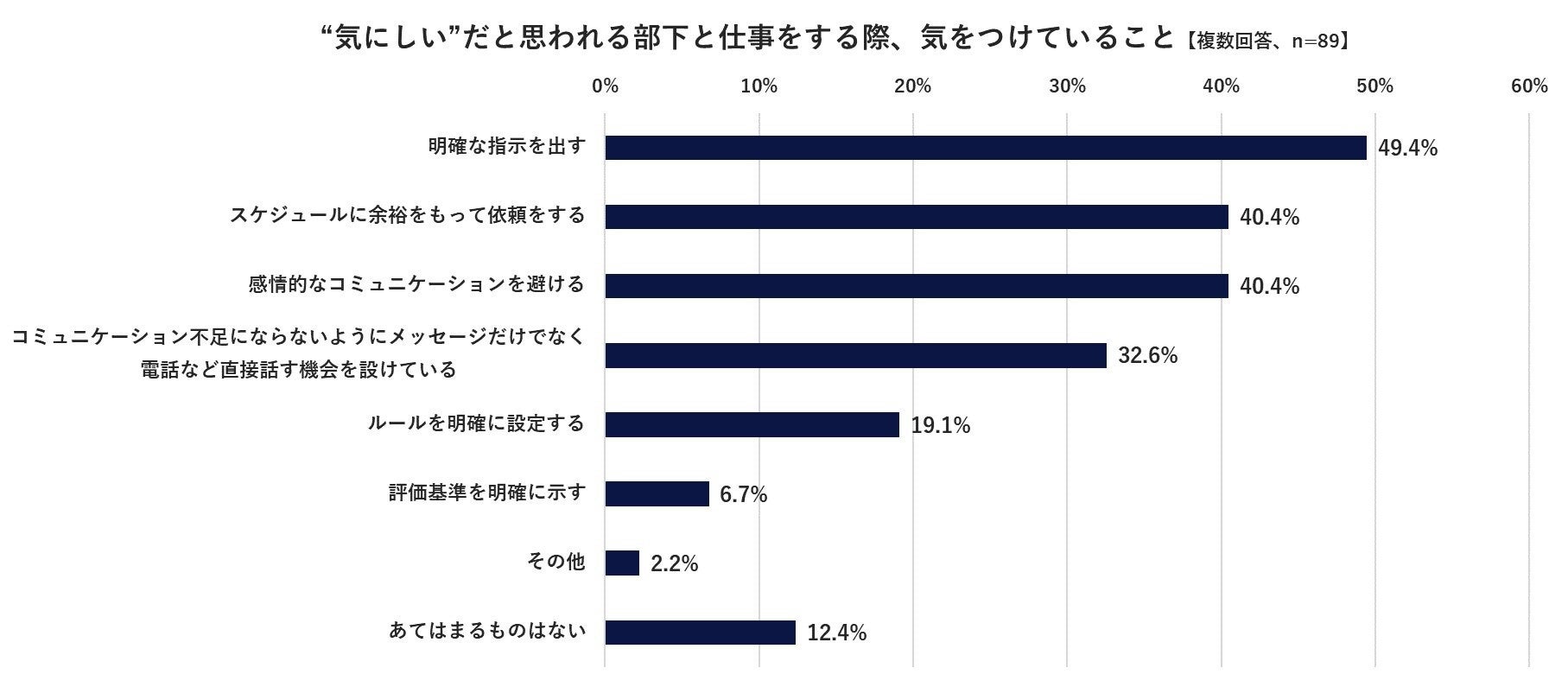 “気にしい”だと思われる部下がいる管理職の方に一緒に仕事をする際、気をつけていることを聞いたところ、「明確な指示を出す」49.4%、「スケジュールに余裕をもって依頼をする」40.4%、「感情的なコミュニケーションを避ける」40.4%でした。