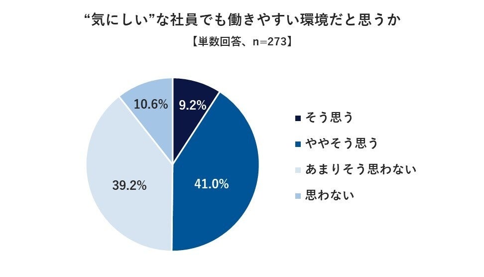 ・“気にしい”な社員でも働きやすい職場環境か、そう思わない49.8%(あまりそう思わない 39.2%、そう思わない 10.6%)