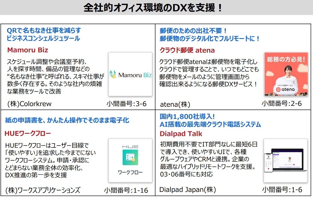 本展は、260社が出展する管理部門の業務改革・DX推進をテーマとした「経営・経理・人事・総務DX推進展」(略称:バックオフィスDXPO東京)内の専門展として開催され、オフィス環境のDXに関するソリューションや新しい働き方を支援する様々なツールが展示され、管理部門必見の展示会となっている。<公式HP https://box.dxpo.jp >