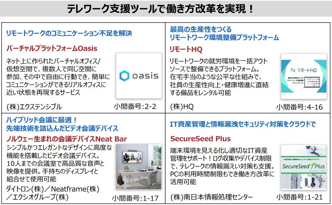 本展はコロナ禍で一気に注目を集めたテレワーク関連サービスをはじめ、コミュニケーションツールやグループウェア、ペーパーレス化ツール、ナレッジ共有ツール、生産性向上ツールなどの最新サービスが一堂に出展し、オフィス環境の最適化を支援する製品を一度に比較検討できる専門展だ。
