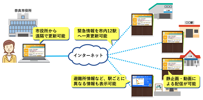 既に放映中の近鉄大和西大寺駅・JR奈良駅のサイネージとともに、年間約6,200万人の鉄道利用者を対象に、新型コロナ情報・災害情報などの緊急情報を含めた市からの情報を、これまでより広く、タイムリーに、伝達できるようになります。