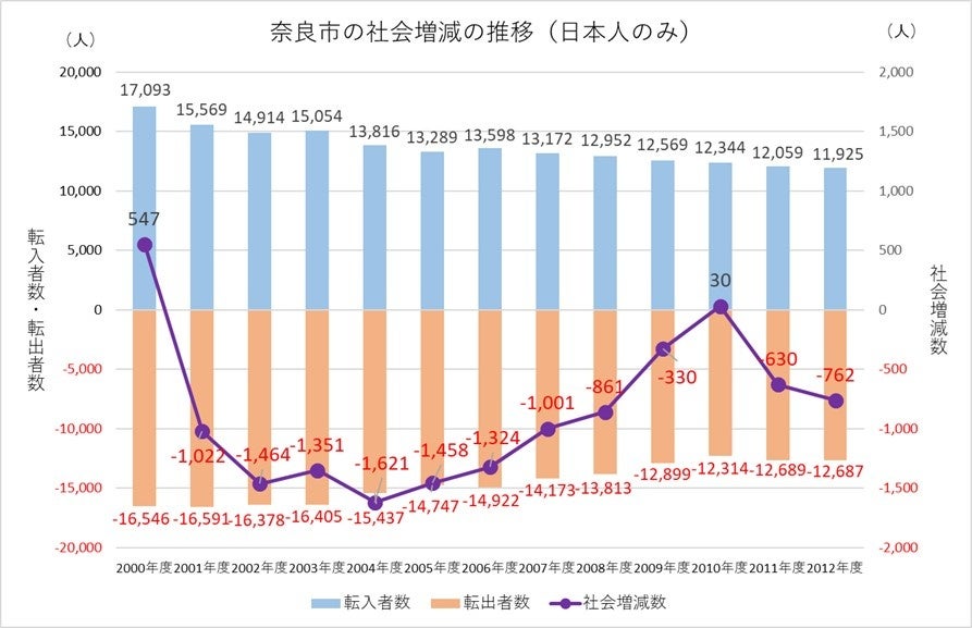 2012年度以前の社会増減の状況をみてみると、2000年度の547人のプラスからその後減少に転じ、2004年度に-1,621人まで落ち込んだ後、2010年度の回復を経て再び減少しています。