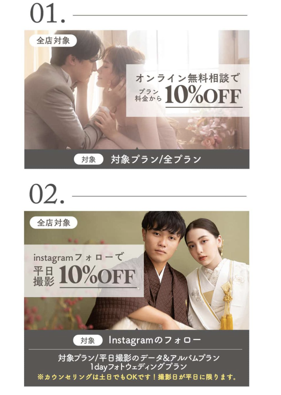 平日撮影が可能なお二人には嬉しい、平日撮影10%オフ特典や