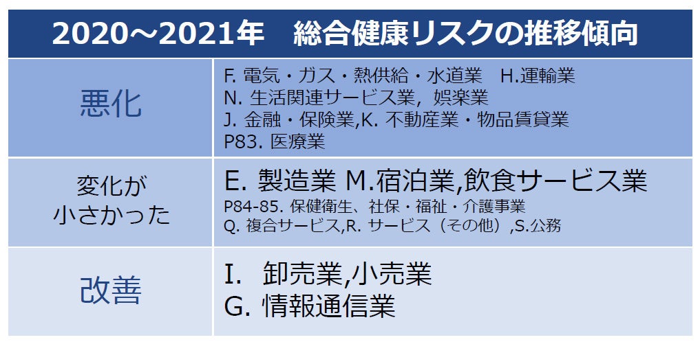 また、2020年から2021年を比較すると、「改善傾向の業界」と「そうでない業界」、あまり結果が変動していない業界に分類が可能でした。