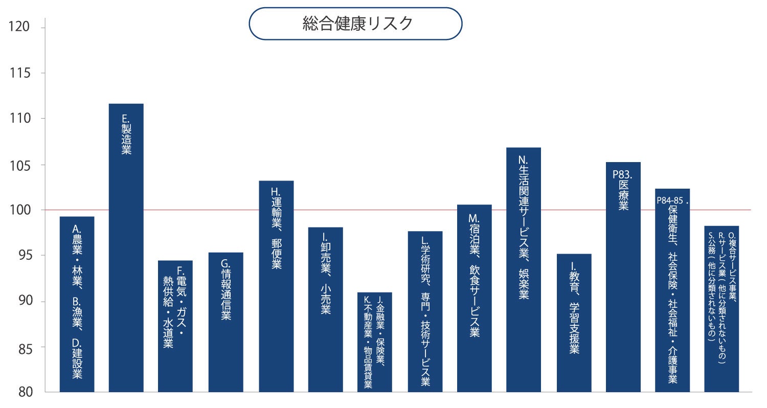 総合健康リスクについては、健康問題発生リスクが全国平均値より10%高いと推定される業種(全国平均値100を10以上上回っている業種)は「E. 製造業」のみという結果になりました。
