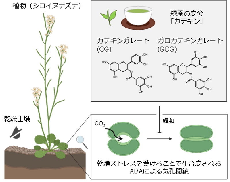 緑茶に含まれる二種類のカテキン(CGおよびGCG)は、乾燥時にABAにより誘導される気孔閉鎖を抑制(緩和)する。