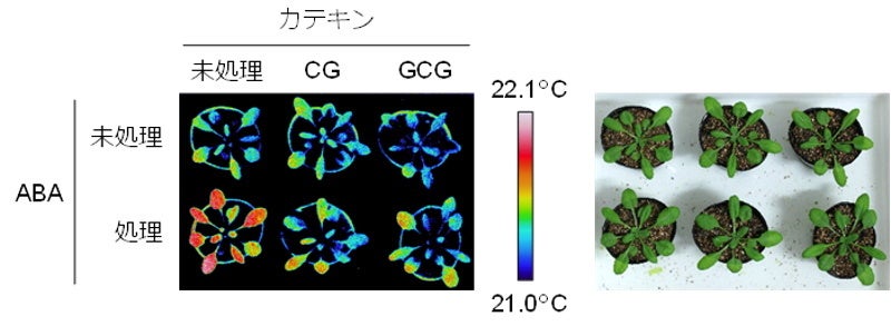 ABAを処理すると気孔が閉鎖し蒸散できなくなり葉面温度が上昇する(左列、緑色(上)→赤色(下))。ABAとカテキン(CG/GCG)を同時処理すると気孔は開口し続けるため葉の温度はほとんど変わらない(中列・右列、緑色(上)→緑色(下))。