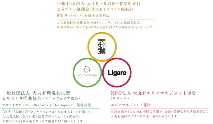 大丸有まちづくり協議会を中心に公民でまちの将来像を合意し、リガーレが賑わいや都市観光を促進、エコッツェリア協会が社会課題の解決や企業連携によるビジネス創発を具体化しています。