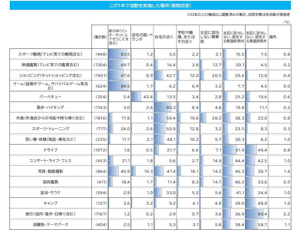 「家の中」での実施に注目すると、「スポーツ・トレーニング」で24.0%、「コンサート・ライブ・フェス」で21.1%、「外食」で17.8%となっています。これらは外出先で実施することが主流でありながらも、自宅でのトレーニングやオンライン配信でのライブ体験、外食店からの宅配やテイクアウトの利用など、家の中での実施者が一定数存在するという結果になりました。
