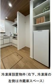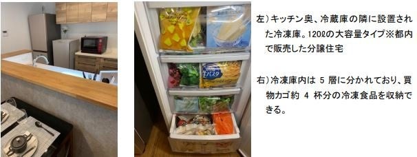 | 当社では、「冷凍食品が増えすぎて、冷蔵庫の冷凍室がいっぱいで困っている」というお客様の意見が増えていることから、戸建て分譲住宅の一部に冷凍庫を標準装備(買い物カゴ約 4 杯分の冷凍食品を保管できる)した物件の販売を始めましたが、大変好評なことから 2021 年度は 240 棟。2022 年も 250 棟以上の供給を予定しています。 |