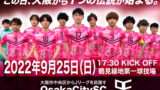 2022年9月25日(日)17:30 キックオフ!鶴見緑地第一球技場にてオフィシャルマッチを開催します!「大阪市中央区からJリーグを目指す」サッカークラブOsakaCitySCはスポーツで大阪を元気にします。