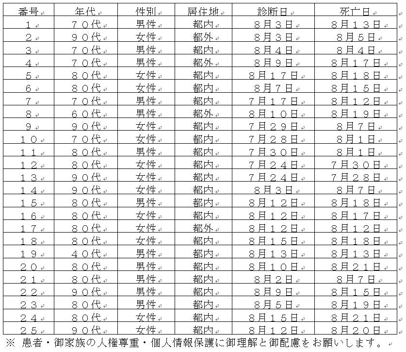 新型コロナウイルスに関連した患者の死亡について business Twitter Facebook はてブ Pocket LINE コピー 2022.08.24 この記事は約1分で読めます。 都内で新型コロナウイルスに感染した方が死亡されましたのでお知らせします。 お亡くなりになった方のご冥福をお祈り申し上げます。