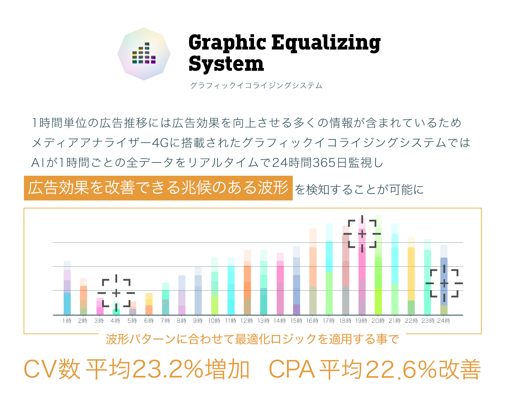 「メディアアナライザー4G」は、独自機能である「グラフィック イコライジング システム」が搭載されており、1時間単位の広告推移をAIがリアルタイムで24時間365日監視し、広告を理想的な状態に調整することで、CPA(※1)の改善や、CPAを維持したまま広告配信量を増加させることができます。