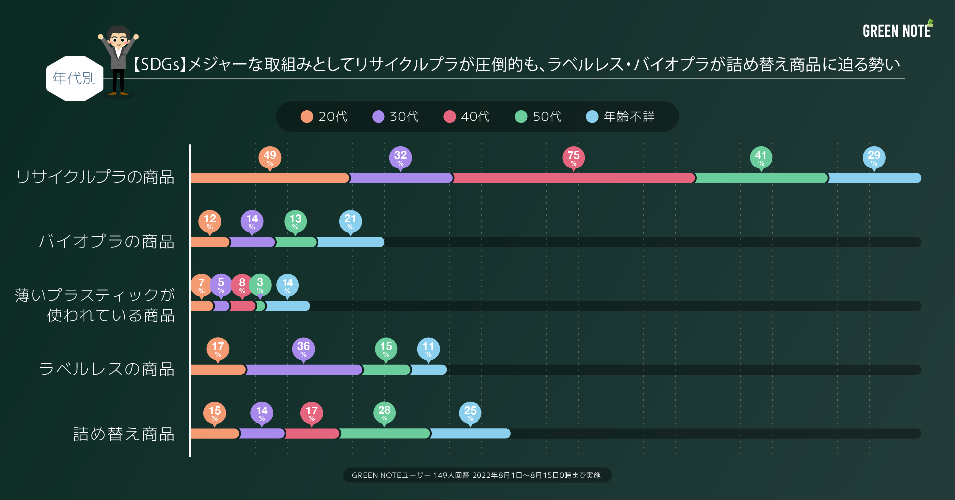 Greenroom株式会社(本社:東京都新宿区、代表取締役:山崎 修平)が運営するサステナビリティ / SDGs専門ニュースアプリ『GREEN NOTE(グリーンノート)』は、SDGsやサステナブルに関する意識を明らかにすることを目的に、サステナビリティに感度の高いアプリユーザー20~50代以上の149名を対象に「よく目にする脱プラ商品」についての市場調査を実施。
