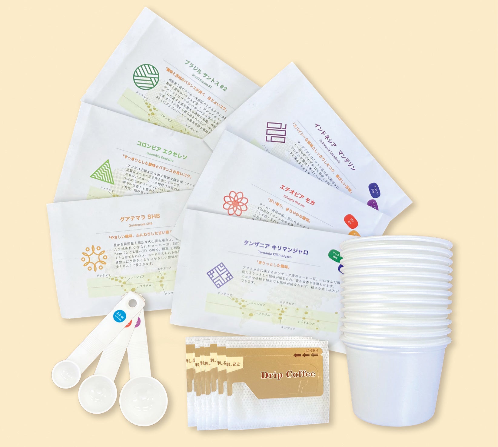コーヒー6種類(各40g)、空のドリップバッグ12個、試飲用カップ12個、メジャースプーン、説明書