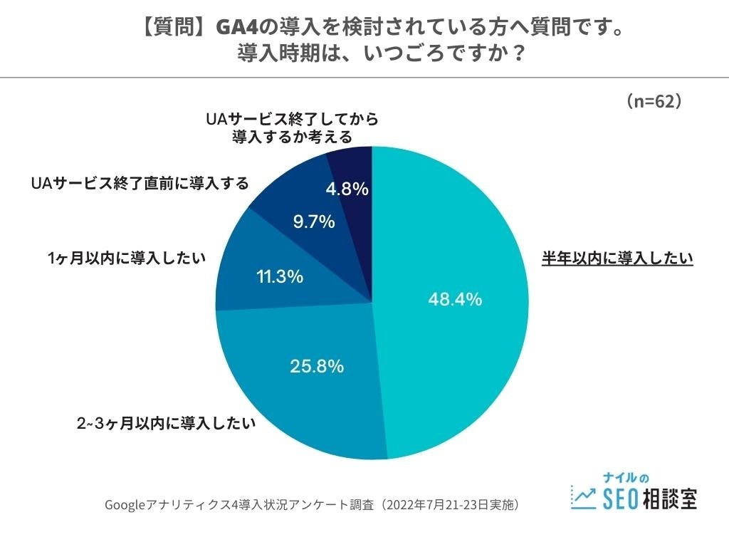 一方で、今後GA4導入を検討している人は、約8割が半年以内での検討をしているため、来年のUAサービス終了に向けて、ベンダーが年内いっぱい混雑する状況が予測されます。