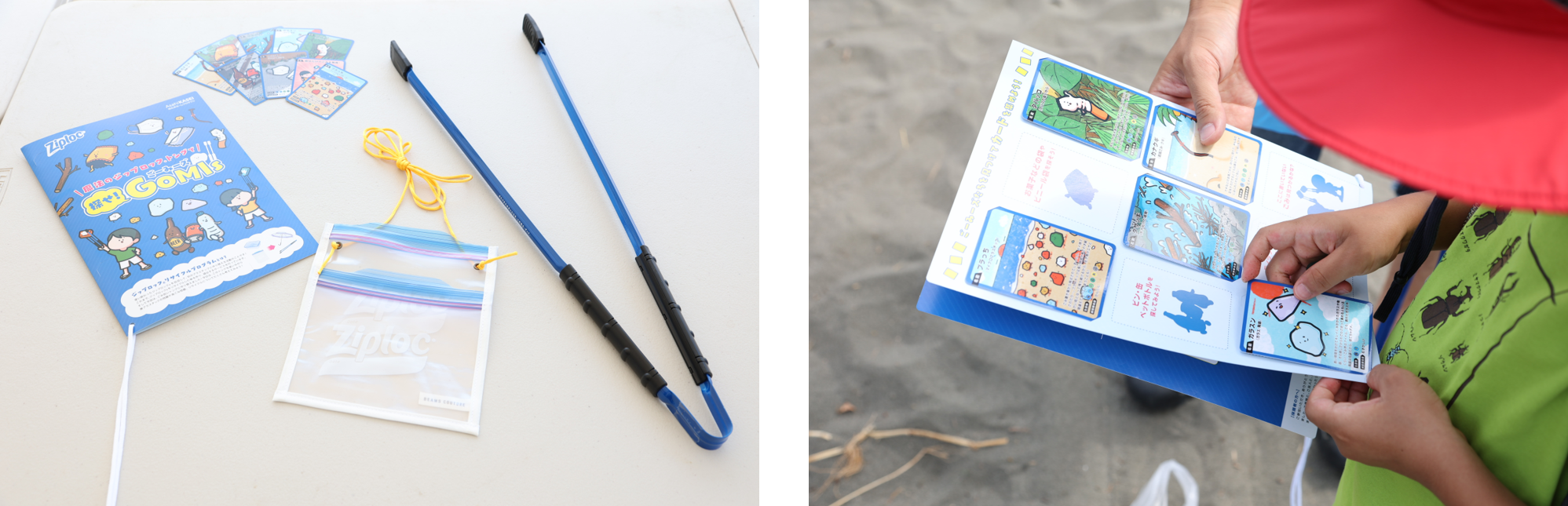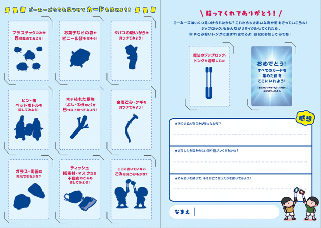 楽しみながらごみ拾いを楽しめる本イベント。受付で配られるゲーム用台紙に、海さくら 代表の古澤純一郎氏が監修し、捨てられやすい9種のごみを拾う「ミッション」が記載されています。 「魔法のジップロック®トング」を使って、ミッションをクリアしていくと、ジップロックⓇオリジナルキャラクター「GOMIS(ごーみーズ)カード」と交換ができます。「GOMISカード」は、大人気のデザイナー・イラストレーターである、しばたまさんの描き下ろしイラストと、各ごみの紹介や課題が記載されています。ゲーム用台紙には、ごみ拾いを通じての学びを記入できます。