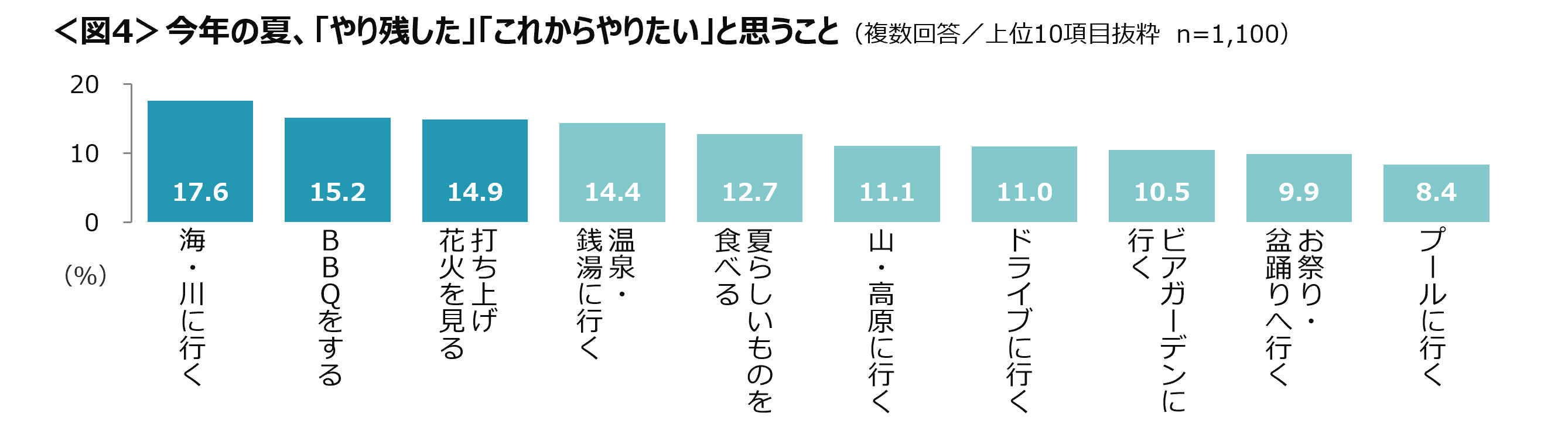 今年の夏、「やり残した」「これからやりたい」と思うことのTOP3は、「海・川に行く」、「BBQをする」、「打ち上げ花火を見る」。<図4>