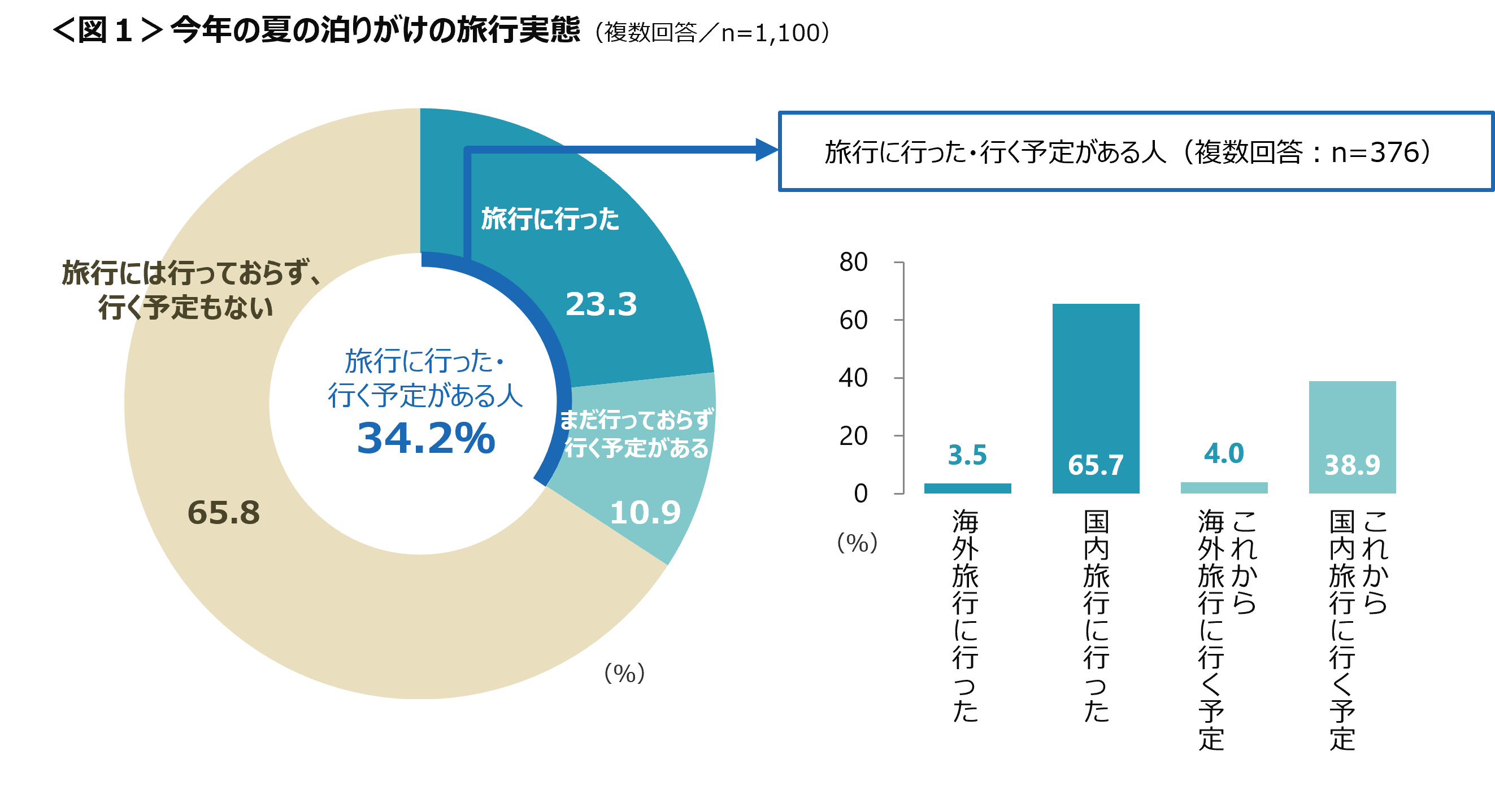 泊りがけの旅行に行った・行く予定がある人のうち、国内旅行に行った人は65.7%。これから国内旅行に行く人は38.9%となった。<図1>
