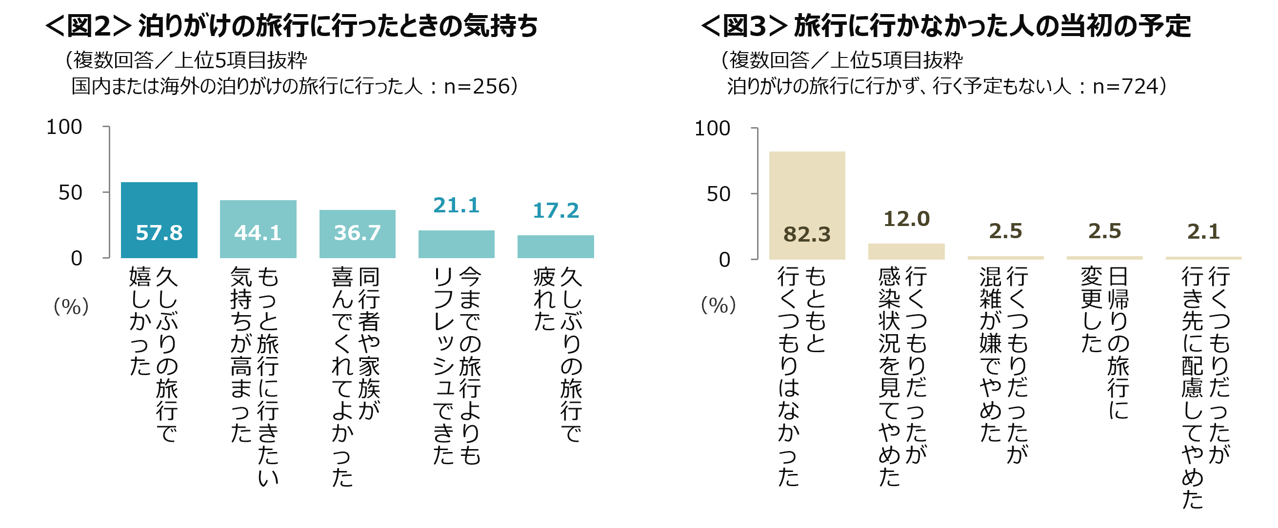 泊りがけの旅行に行った人では、「久しぶりの旅行で嬉しかった」が6割近い。「もっと旅行に行きたい気持ちが高まった」も4割を超え、久しぶりの旅行を楽しめた様子。