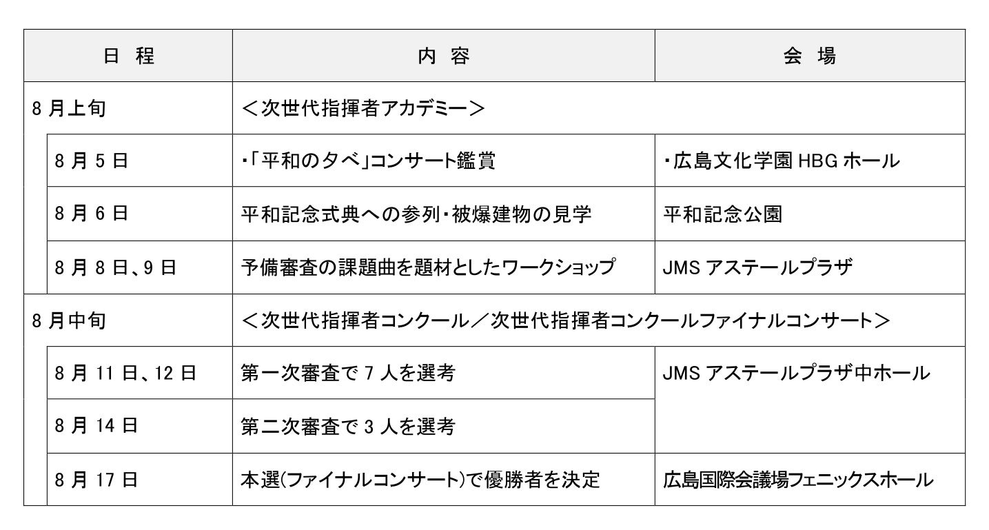参加者は、コンクール前に、平和記式典や「平和の夕べ」コンサート等の諸行事への参加を通じて広島の歴史や平和への取り組みを学ぶとともに、予備審査の課題曲「ハイドンの交響曲」を題材とし、広島交響楽団音楽総監督・広島ウインドオーケストラ音楽監督の下野竜也氏によるワークショップに参加。 その後、第一次審査、第二次審査を行い、本選(ファイナルコンサート)で、優勝者を決定しました(コンクールは、一般公開(有料)で行いました。)