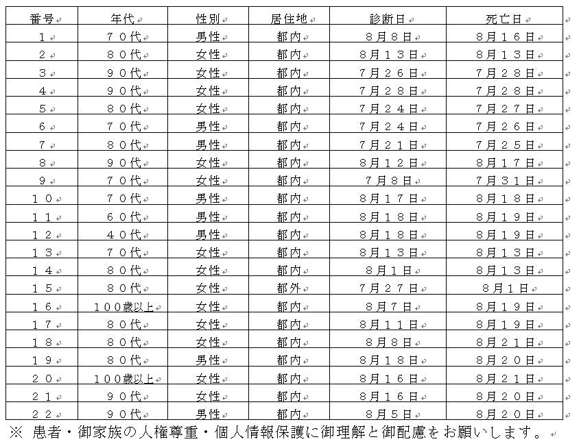 新型コロナウイルスに関連した患者の死亡について business Twitter Facebook はてブ Pocket LINE コピー 2022.08.24 この記事は約1分で読めます。 都内で新型コロナウイルスに感染した方が死亡されましたのでお知らせします。 お亡くなりになった方のご冥福をお祈り申し上げます。