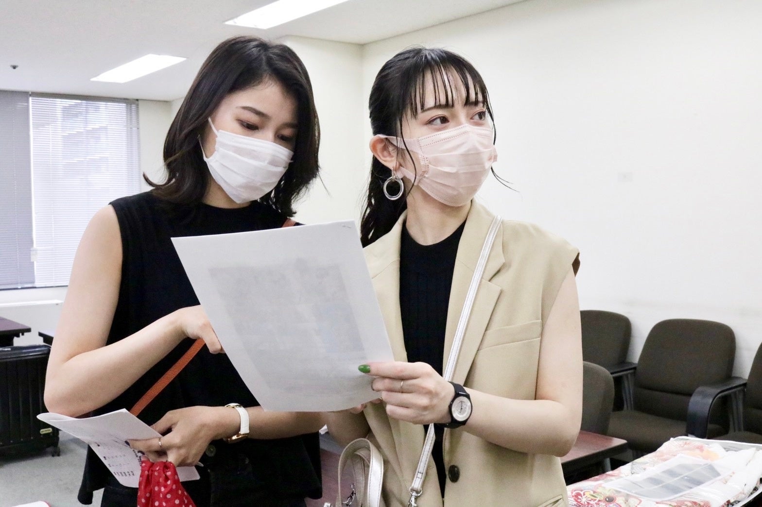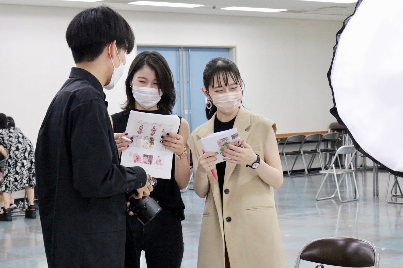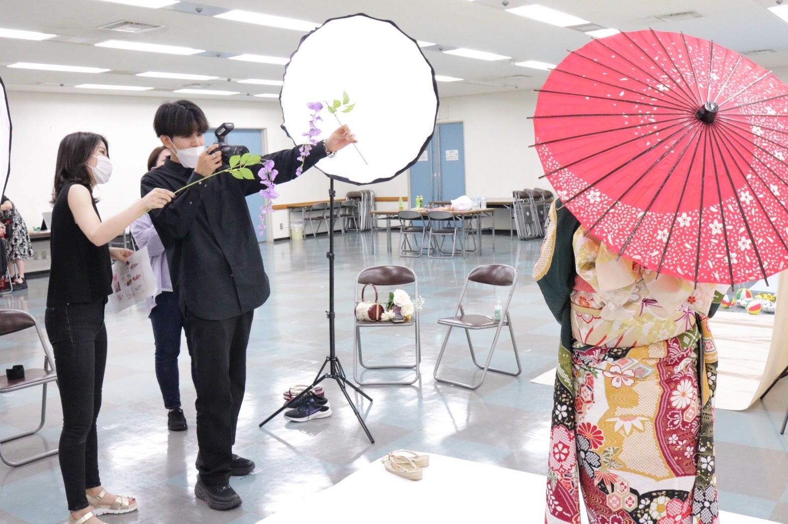 撮影会へ参加した女性達は、数種類の豪華な振袖の中から着付けの先生やミスユニバーシティファイナリスト達と相談し気に入った一枚を選び、初めてのメイク、本格的な撮影を経験した。