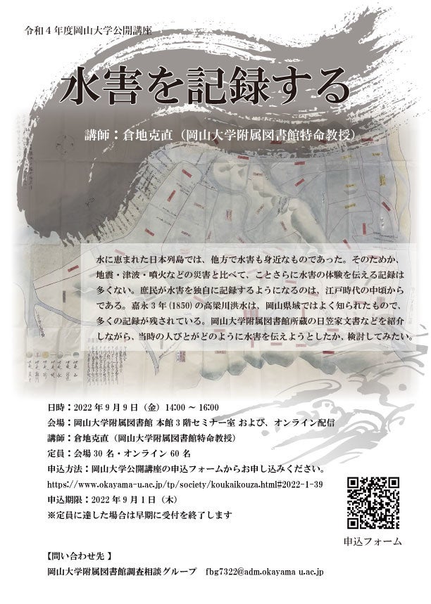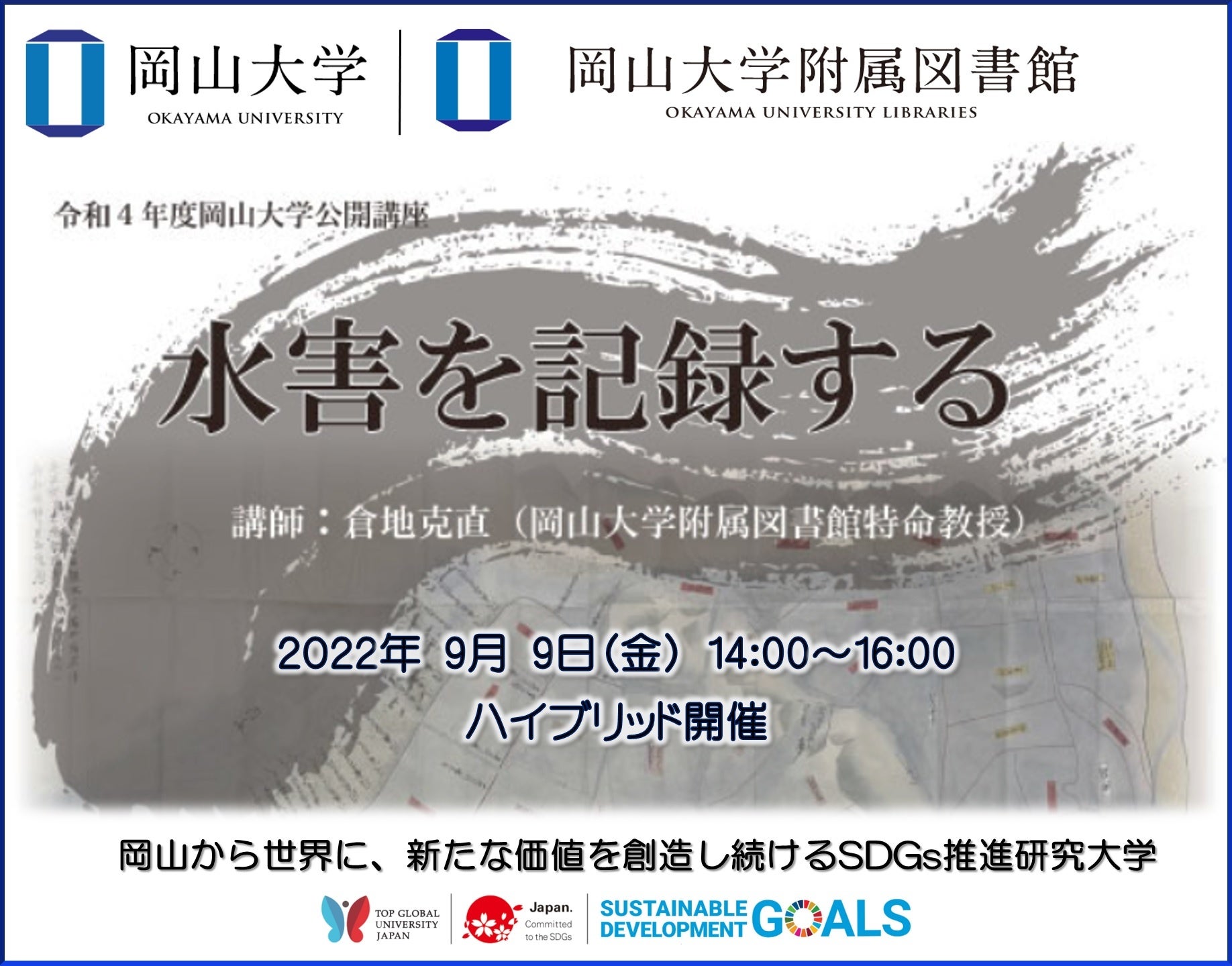 国立大学法人岡山大学(本部:岡山市北区、学長:槇野博史)の附属図書館では、本学特命教授の倉地克直先生を講師として、公開講座「水害を記録する」を2022年9月9日(金)に会場とオンライン同時配信のハイブリッド方式で開催します。また、同時に、図書館内にて関連資料の展示を行います。
