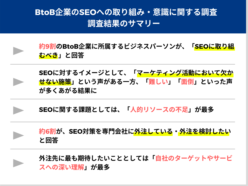SEO対策に関しては、BtoB企業に勤める多くのビジネスパーソンがその重要性を感じている一方で、「専門性が必要で難しい」「労力や手間がかかる」というイメージを多くお持ちの方が多いことが改めてわかりました。